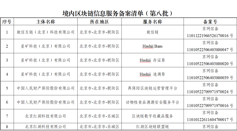 第八批境内区块链信息服务备案编号由国家互联网信息办公室正式公布