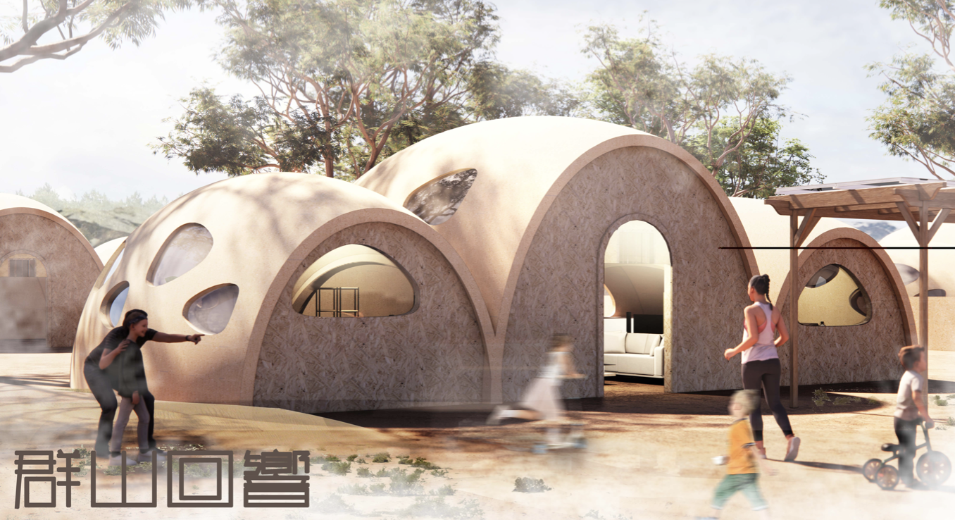 来自同济大学的王科润团队在作品“群山回响”中构思了一种三联拱结构的新式民宿。他的灵感正是来源于我国的山脉和传统三孔窑洞形态。“设计采用模块化概念,将水电设施放入能源模块,将起居放入家具模块,最后对模块进行整合,组成整体的建筑。”