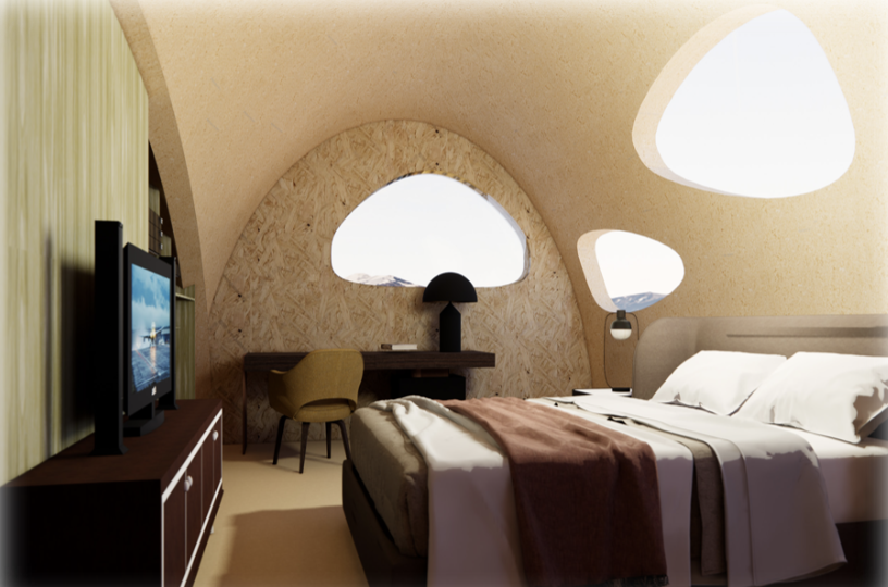 搭建过程采用“模—膜”组合的建筑形式。设计团队介绍,用集装箱将在工厂预制的气膜模具、能源模块、家具模块运输到指定地点后,可以直接将集装箱侧壁展开,进行气膜模具搭架。气膜充气后,用机械臂在气膜曲面表面喷涂聚氨酯定型,然后在聚氨酯表面覆黄土。