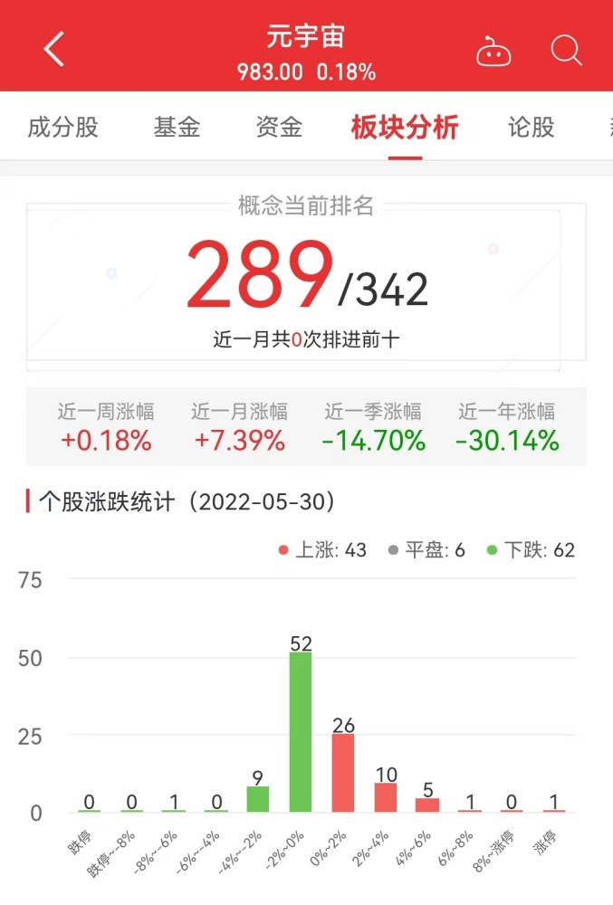 中国经济网北京5月30日讯 今日,元宇宙板块整体涨幅0.18%,其中43只股票上涨,6只股票平盘,62只股票下跌。