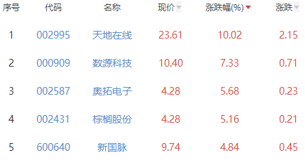 其中,天地在线、数源科技、奥拓电子、棕榈股份、新国脉位列板块涨幅前五位,涨幅分别为10.02%、7.33%、5.68%、5.16%、4.84%。