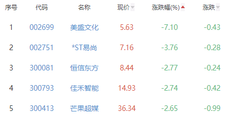 美盛文化、*ST易尚、恒信东方、佳禾智能、芒果超媒位列涨幅榜后五位,涨幅分别为-7.10%、-3.76%、-2.77%、-2.74%、-2.65%。