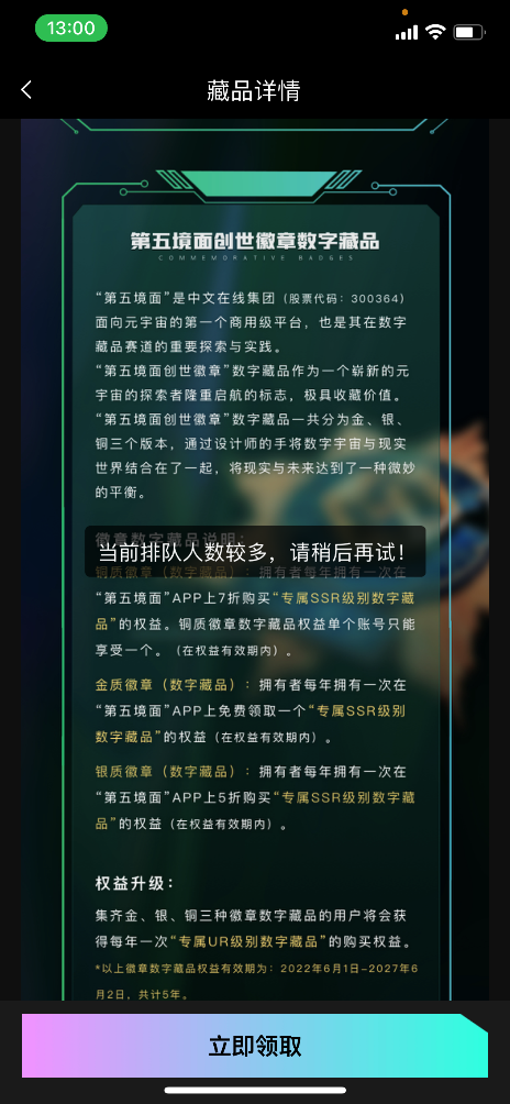 界面新闻记者尝试在“第五境面”APP数字藏品上线首日(11:00、13:00、15:00、17:00)四个发放时间点领取空投藏品,每个准点限量投放500份,不过当日实际情况为一旦到达发行准点网络便出现挤爆状态,待网络恢复时数字藏品已被秒完。
