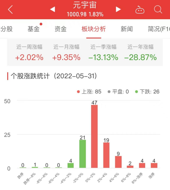 中国经济网北京5月31日讯 今日,元宇宙板块整体涨幅1.83%,其中85只股票上涨,0只股票平盘,26只股票下跌。