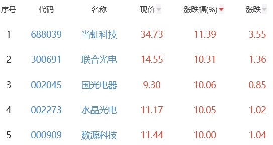 其中,当虹科技、联合光电、国光电器、水晶光电、数源科技位列板块涨幅前五位,涨幅分别为11.39%、10.31%、10.06%、10.05%、10.00%。