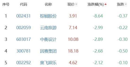 棕榈股份、云南旅游、中衡设计、因赛集团、奥飞娱乐位列涨幅榜后五位,涨幅分别为-8.64%、-2.99%、-2.89%、-2.68%、-2.12%。