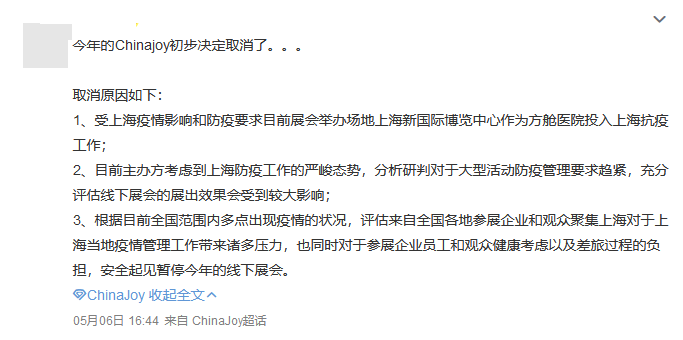 实际上,5月初就有相关信息表示基于疫情影响和防疫要求,今年ChinaJoy初步决定取消线下展。