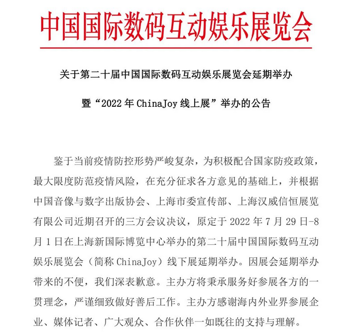 原题:受疫情影响,ChinaJoy首次延期,增加线上展会