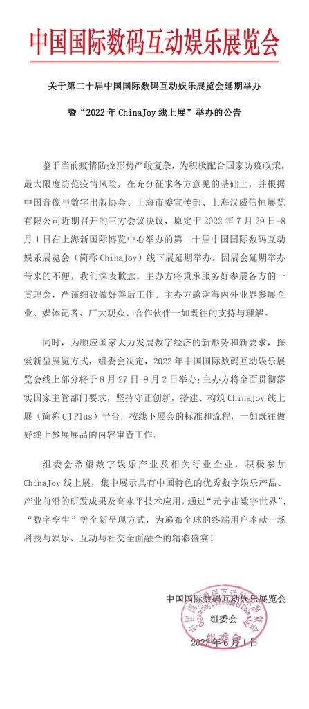 6月1日,ChinaJoy组委会发布了第二十届ChinaJoy线下展会延期举办的官方公告,同时还公布将于8月27日至9月2日举办2022年ChinaJoy线上展(简称CJ Plus)。