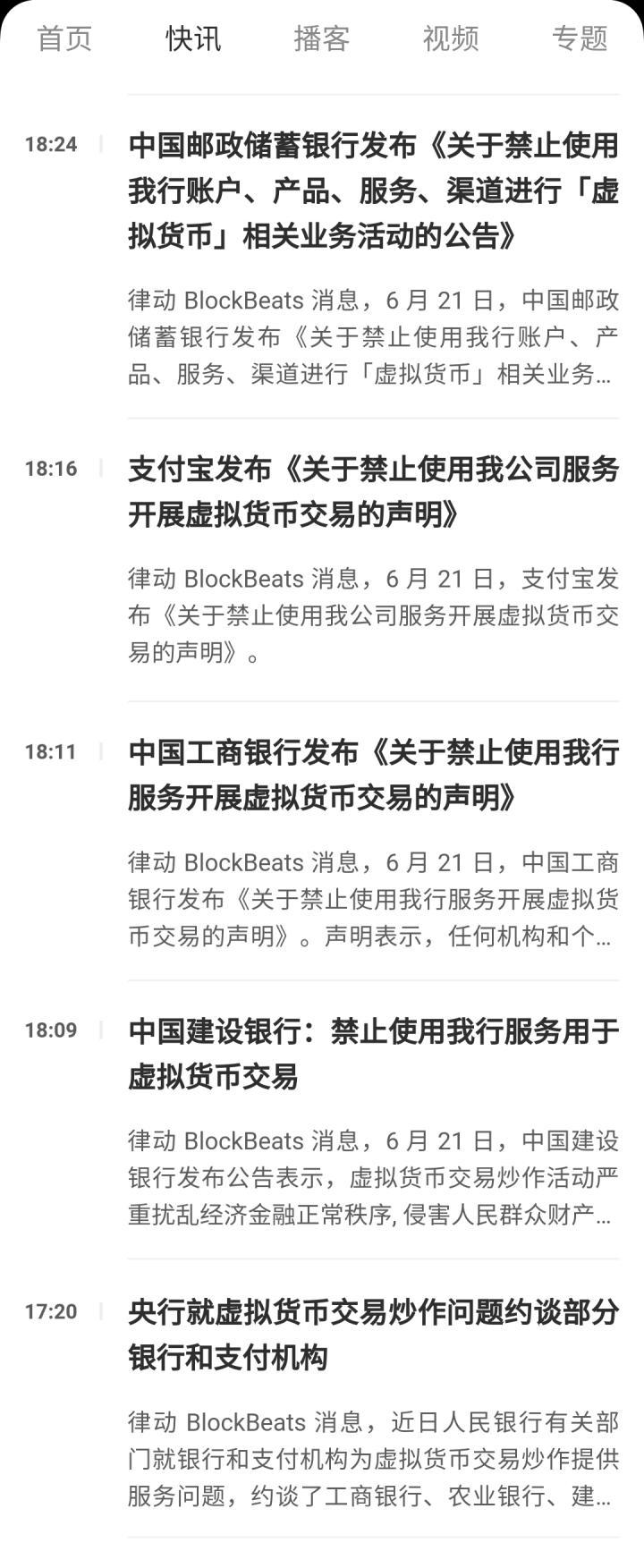 这次银行对外的发声,一开始是农行先发了声明,但是旋即就删掉了。而后是央行在官网和公号发布公告。后续开始刷屏,工商银行、建设银行、支付宝等机构接连发布了《关于禁止使用我行服务开展虚拟货币交易的声明》。