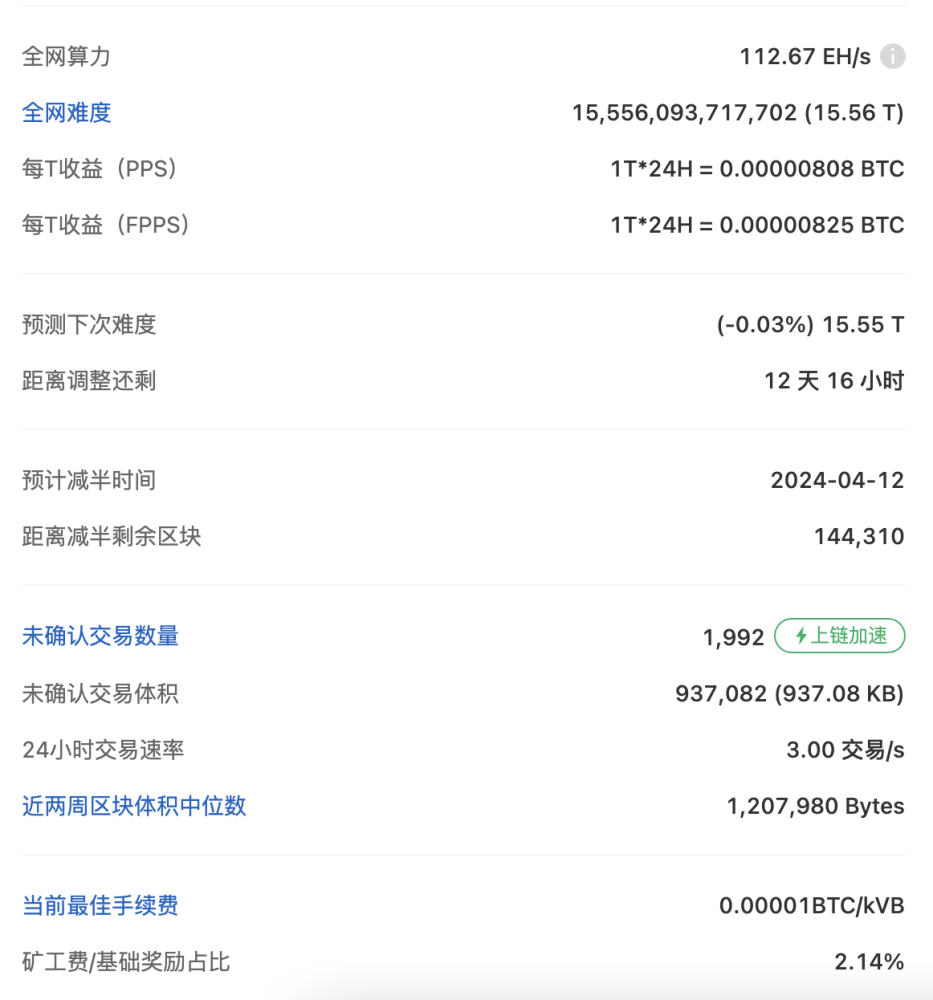据BTC.com数据,目前比特币未确认交易量为1992笔。全网算力为112.67 EH/s,24小时交易速度3.00 txs/s。当前挖矿难度为15.56 T,距离难度调整还有12天16小时,预计下次挖矿难度将下调0.03%至15.55 T。