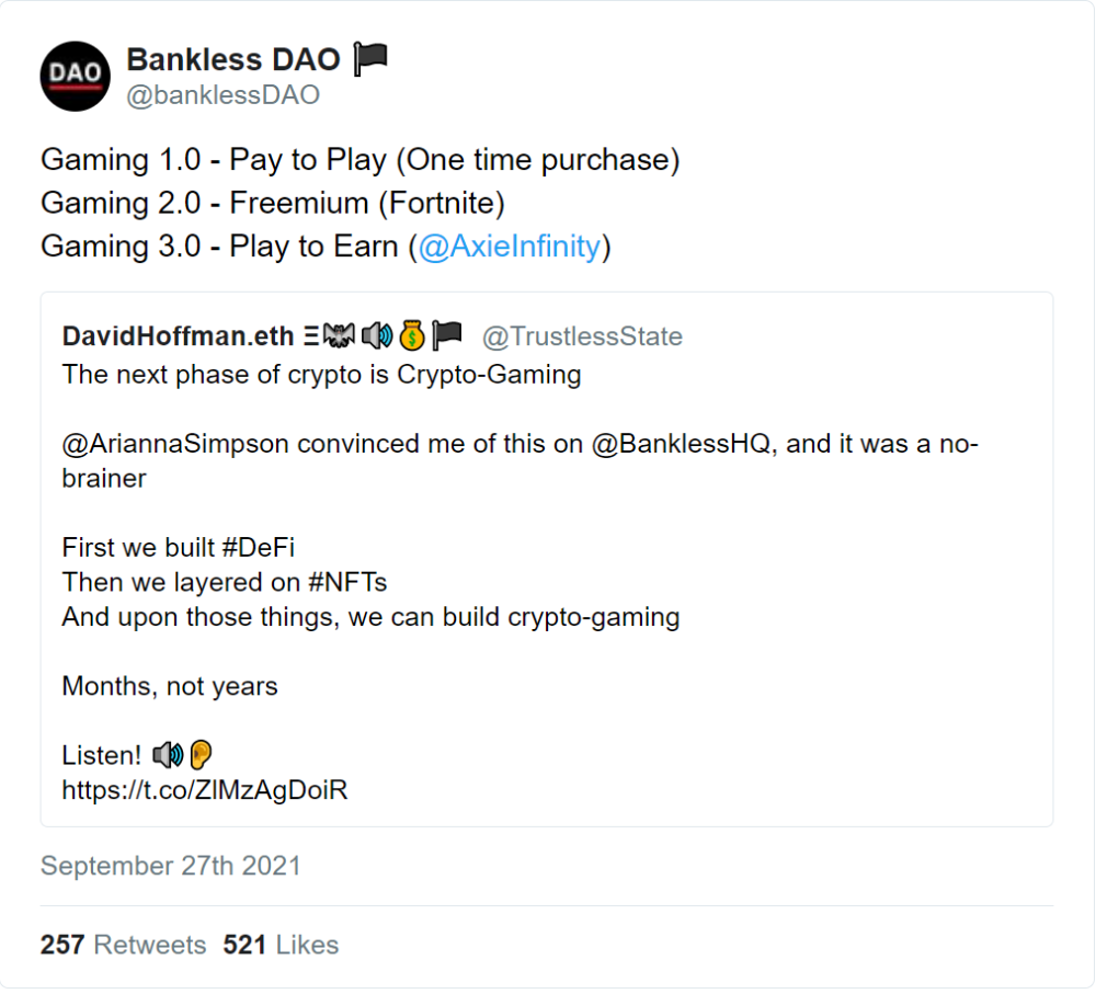 那么,为什么Play to Earn突然间有了起色?有几个复合的因素。首先,主流对加密货币的认识不断提高,意味着更多的人愿意涉足这一领域。我们在DeFi 2020年夏季和NFT热潮中看到了这一点。