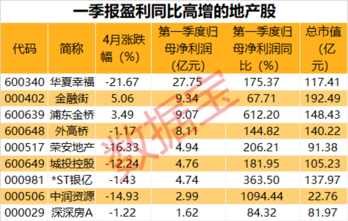 数据宝统计,9只地产股第一季度实现归母净利润超1亿元,同比增长率超过50%,包括中润资源、浦东金桥、*ST银亿等。华夏幸福、金融街、浦东金桥盈利最高,实现归母净利润均在9亿元以上。