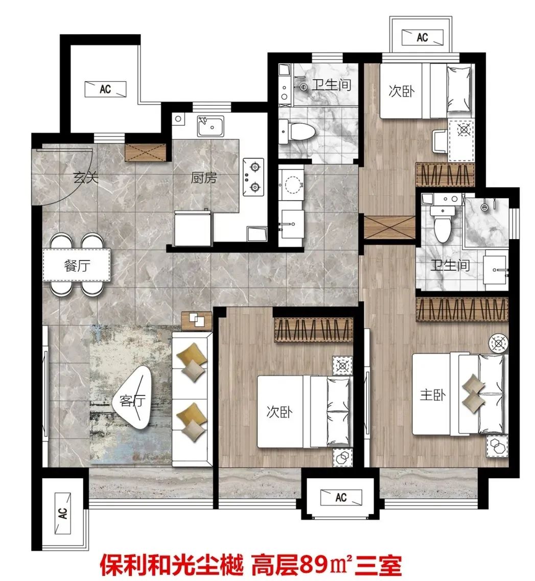比如保利和光尘樾,87平米就做到了三室两厅两卫,89平米更优。