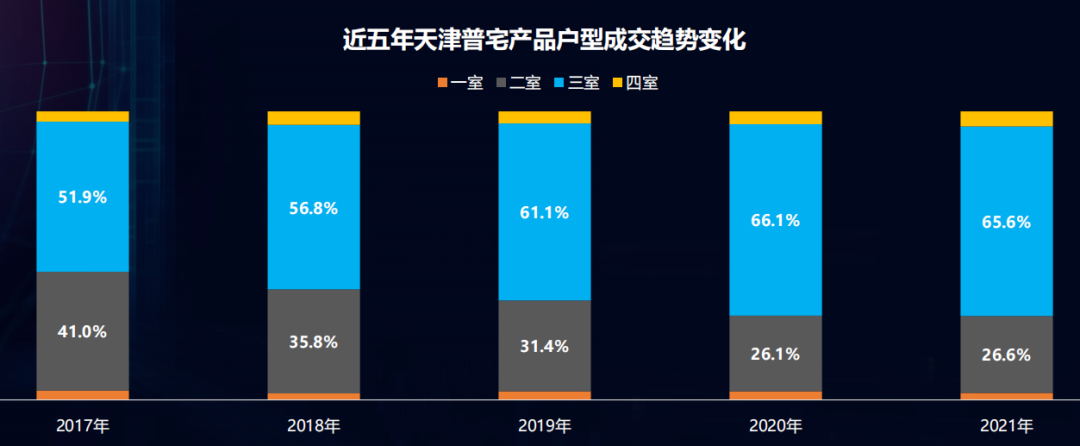 近五年来天津新房市场中,两室成交占比逐年下降,由2017年的4成下降至目前的不到3成。