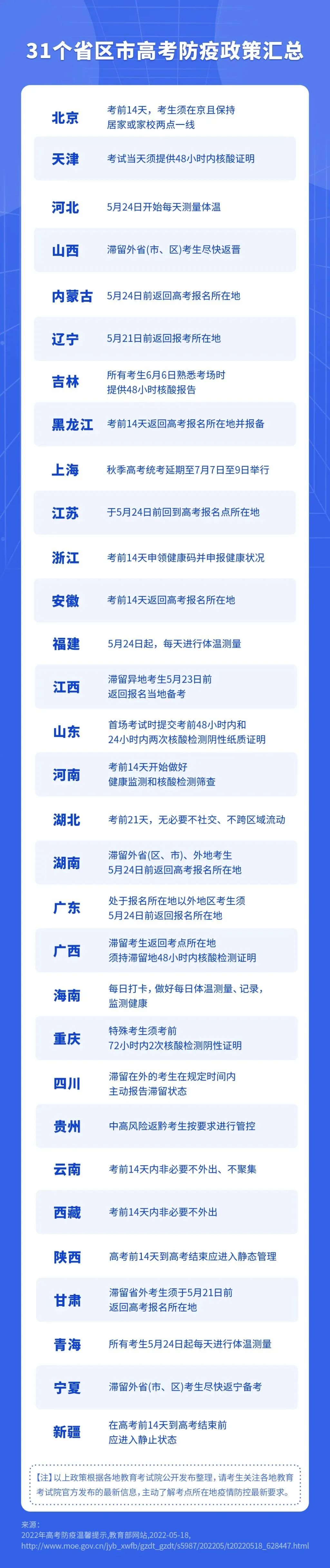 摘要:2022年高考即将来临 滞留外地的考生如何返回? 考前需要几次核酸? 考生家长需要如何配合? 山东: 首场考试时提交考前48小时内和24小时内两次核酸检测阴性纸质证明。 务必于5月24日(考前14天)前返回高考报考地点并做好自我防护。提前申领“山东省电子健康通行码”,外省来鲁考生请在电子健康码界面填写“来鲁申报”。 所有考生须在首场考