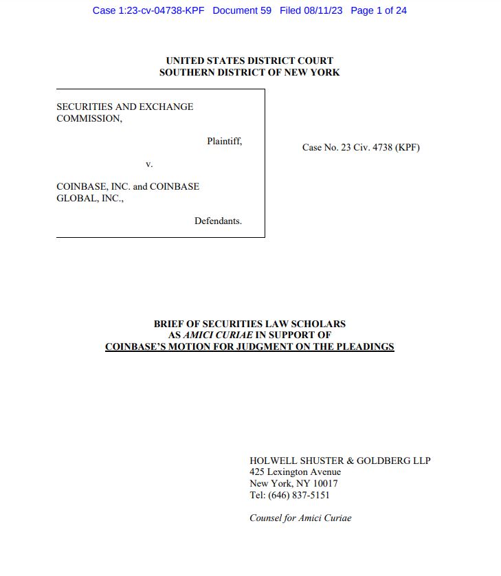 在虚拟货币交易所 Coinbase 与美国证券交易委员会(SEC)正在进行的法律诉讼中,由六位专门研究证券法及相关领域的法律学者组成的小组提交了一份法庭之友书状,支持 Coinbase。