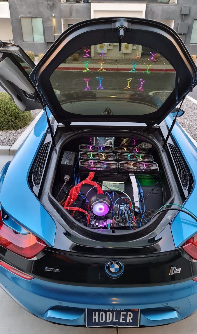 这家加拿大制造商并不是第一个提出在汽车上安装加密货币挖矿硬件的公司。半年前,加密货币交易员、矿工和持有者西蒙·布莱恩(Simon Bryne)在他的宝马i8混合动力车中安装了六张PNY GeForce RTX 3080显示卡,一个ASUS B250 Mining Expert主机板以及一个EVGA SuperNOVA 1600 T2电源,组建了一个以太坊矿机。