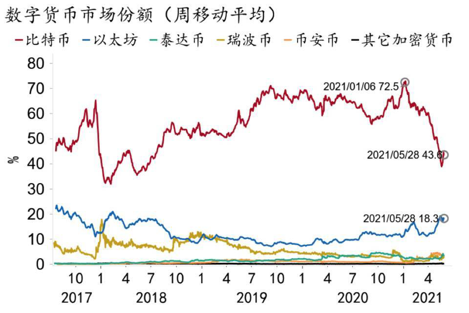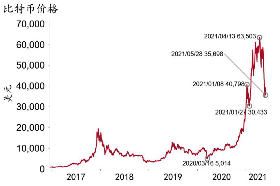 进入 5 月,今年以来一路高歌猛进的比特币出现崩盘式行情。5 月 11 日,特斯拉老板埃隆·马斯克宣布中止接受比特币购车付款计划,比特币和其他加密货币价格应声大跌,一周时间内下挫三成;由于币圈(挖币、炒币)在中国异常活跃,从保护投资者利益出发,5 月 18 日中国互联网金融协会等三家行业协会发文,要求成员机构不得开展与虚拟货币相关的业务;5 月 21 日,国务院金稳委第五十一次会议进一步明确「打击比特币挖矿和交易行为」。至此,币圈风云突变,比特币价格从 4 月的历史高点下跌幅度最多接近五成。