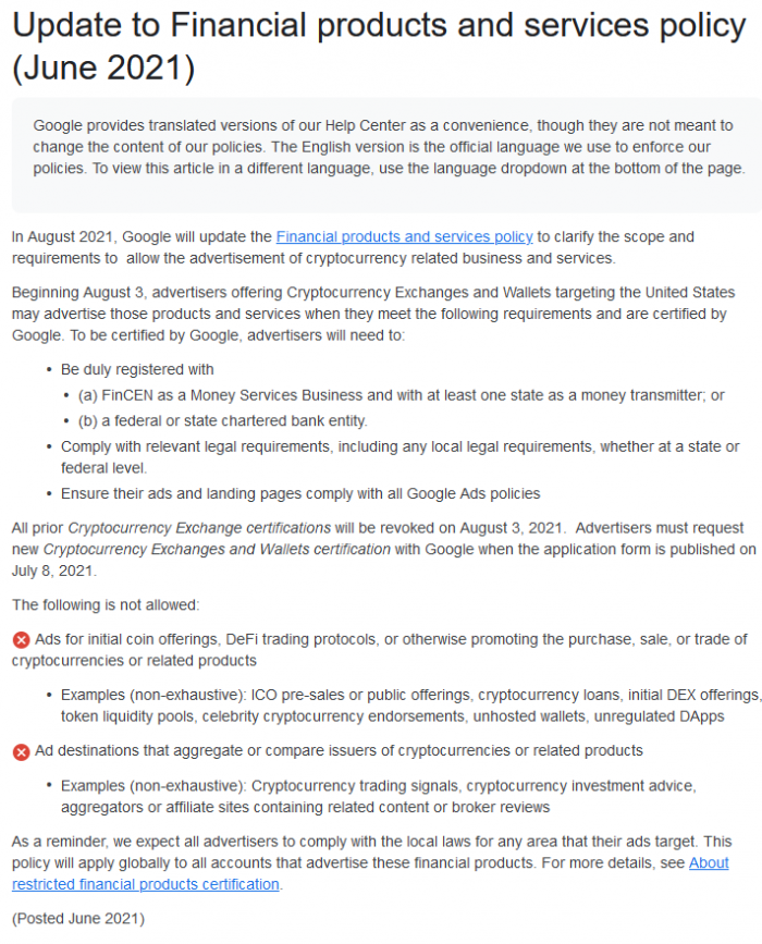 根据Google的政策,从8月3日开始,提供针对美国的加密货币交易所和钱包服务的广告商可以在满足要求并获得Google认证的情况下宣传这些产品和服务。