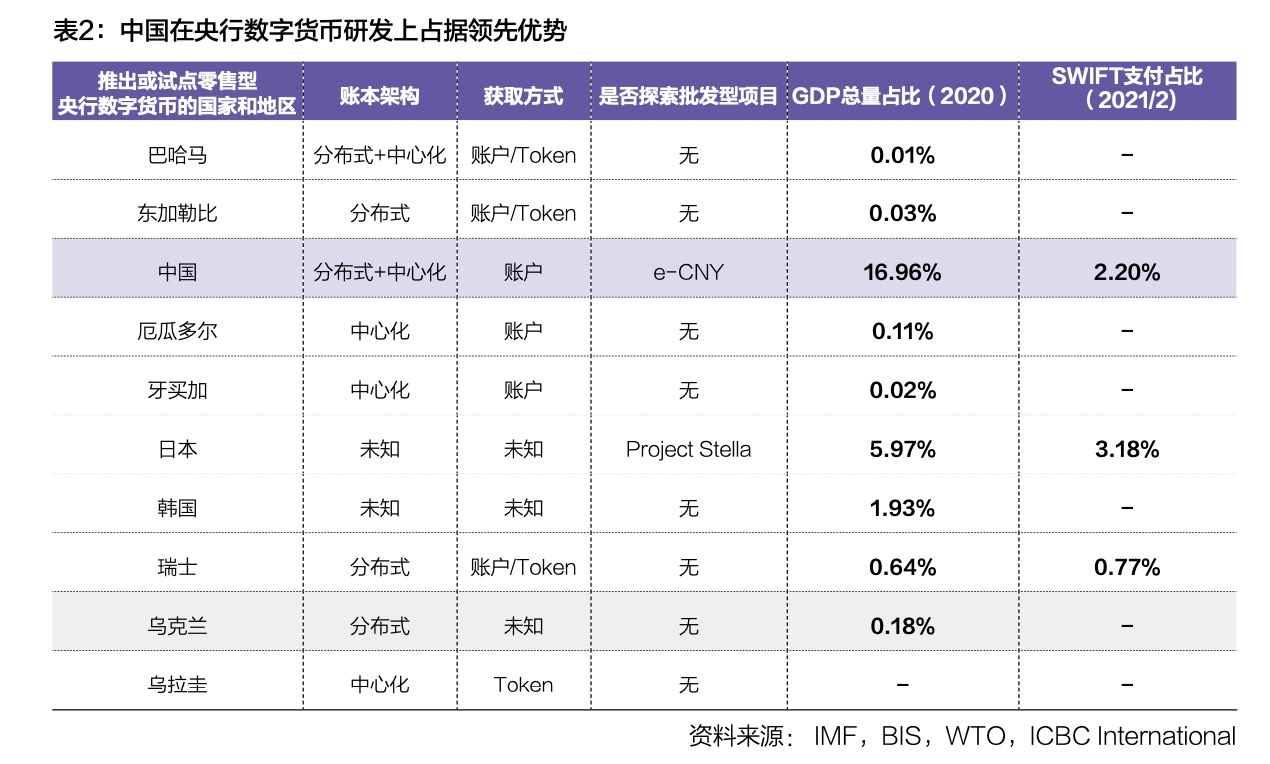 值得注意的是,多边央行数字货币桥有望推进DCEP批发应用,赋予DCEP国际货币新格局先发优势。零售型CBDC直接面向公众推出,而批发型CBDC则仅在央行与金融机构之间使用。一直以来,央行数字货币采用零售型还是批发型的设计方案并未定论,但零售型数字货币改革更为激进,面向公众影响范围更大,实际推进较为缓慢。根据国际清算银行2021年4月的最新统计,仅有巴哈马和东加勒比两国央行发行了零售型CBDC,而同期已有11国央行在批发应用上取得实际成果。中国推出的数字人民币可能是目前正在试点中最先进的零售型CBDC,试点规模已达1.5亿元。如表2所示,在发行或开启试点的8国中,中国的经济实力与既有货币实力均位于前列。在设计上,数字人民币采用“央行-商业银行”双层架构,面向公众的实时支付仍由金融机构处理,中央银行定期汇合并更新账本。虽然主要仍采用以银行账户为基础的支付模式,但不同额度下的账户松耦合也提供了有限匿名性。此外,数字人民币并未止步于国内交易场景,正在考虑将零售型与批发型应用相结合,占据国际货币新格局的先发优势。我们认为,中国央行与香港金管局、泰国央行和阿联酋央行共同发起的多边央行数字货币桥研究项目,可能将成为未来国际数字货币体系的一种重要形态。相比传统法币,央行数字货币的设计机制可选择机动性强,发展进度参差不齐,因此,新的国际货币体系需要考虑如何将不同形态不同阶段的央行数字货币融合。根据国际清算银行的研究报告《Multi-CBDC arrangements and the future of cross-border payments》中所述,多边央行数字货币桥中建立共享的统一标准的“走廊”网络,各国央行可以将本国数字货币在网络中发行存托凭证,实现在网络中的单账本交付。而对于没有推出央行数字货币的国家,其中央银行的法币结算系统也可以接入“走廊”网络。这种形态能够绕开以美元为基础的SWIFT体系,对货币弱势国家的主权形成保护,同时有助于实现亲诚惠容的国际贸易合作。但是国际清算银行的报告中也提出了新的挑战,多边央行数字货币桥需要参与的各国央行共同治理并协作制定标准,从这个意义上说,多边央行数字货币桥的参与方数量将受到局限,根据全球价值链的多中心格局可能会出现“多桥并行”的货币新格局。数字人民币将零售型与批发型有机结合,有望成为这一新格局的领头羊。