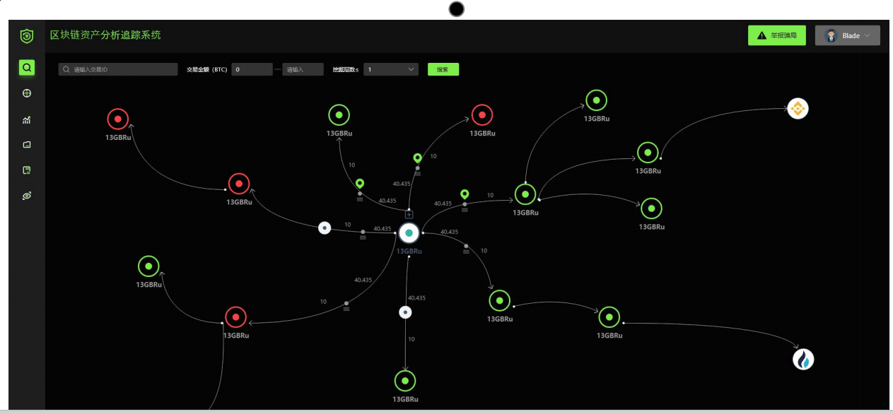 区块链资产追踪系统基于已有的原数据,提供一整套包括黑名单地址监控、地址风险分析评估、关联交易 可视化路径分析等解决方案。该系统开放查询,且可在日常运营过程中直接输入查询地址,进行查询地址 风险分析并结合已有的风控平台实施封堵,熔断等应急响应举措。