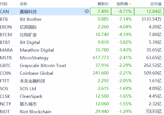 9月16日,美股区块链板块走低,嘉楠科技跌超8%,Bit Brother跌超7%,亿邦国际、比特矿业跌超4%,Bit Digital、Marathon Digital、Coinbase等跟跌。