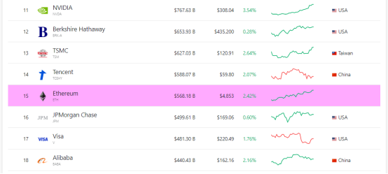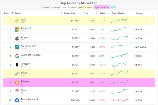 11月9日,比特币创下68000美元以上的历史新高,其市值达到1.27万亿美元,超过了特斯拉和Meta(Facebook),逼近白银市值(1.37万亿美元)。以太坊的市值排名也上升到了第15名,紧随腾讯之后。