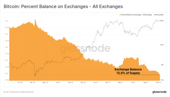 随着价格上涨,投资者积累比特币的趋势似乎没有放缓——越来越多的BTC被转移到冷钱包中,中心化交易平台上的BTC余额占总流通量的比例降到了12.9%的历史低点。
