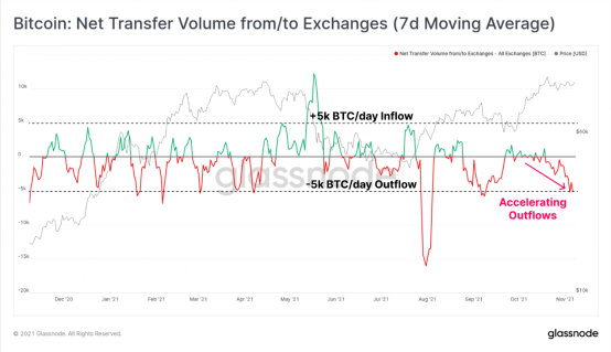 数据显示,上周有超过5000 枚BTC(约3.5亿美元)从中心化交易平台撤出。