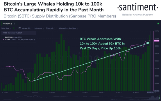 值得注意的是,余额在10000-100000 BTC 之间的钱包地址,即所谓的“比特币巨鲸”一直在加速买入。这些实体在过去5天里积累了43000 BTC,在过去25天里积累了约 92000 BTC。