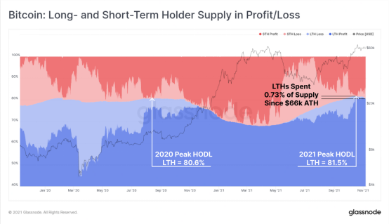 2020年8月,长期持有者拥有的筹码占流通量的比例达到80.6%的高位,然后该比例逐渐下降至68%(派发筹码),直至2021年4月上涨至66000美元的阶段顶部。最近,长期持有者筹码占流通量的比例再次达到81.5%的新高,目前仅花费了流量量占比0.73%的筹码(并未开始大量套现)。