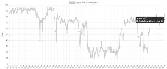 尽管大环境和长期趋势均比较乐观,但11月9日,加密货币市场的短期恐惧贪婪指数达到了84的高位,市场情绪处于“极度贪婪”,市场随即开启了回调。目前,恐惧贪婪指数降至75,略有回落,仍然需要注意短期风险。