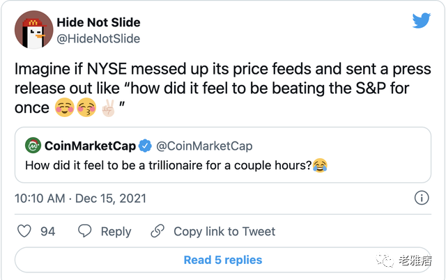 这家数字资产交易所Binance旗下的公司以典型的古怪的加密货币方式作出回应:用口若悬河、充满调侃的方式发了推特——"当了几个小时的万亿富翁,感觉如何?"其中一条写道,后面还有喜极而泣的表情符号。一些行业观察家的反应并不那么乐观。