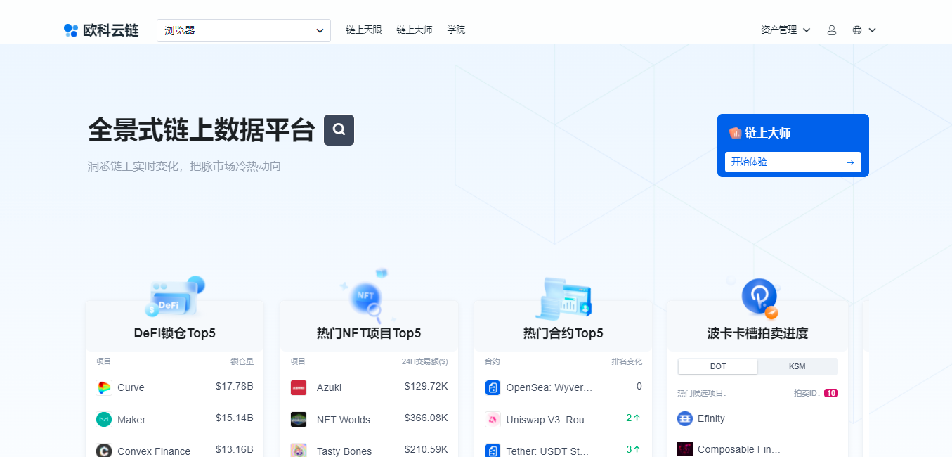 目前,欧科云链链上大师2.0已涵盖DeFi、机构数据、NFT排行榜、波卡生态、热门合约、GameFi、EIP-1559七大热门专题,在为用户提供更全面的数据排行榜的同时,还支持中文、英文、西语、日语等11个语种,旨在为全球用户带来多样化、全方位、本地化、可读写的区块链链上数据服务。