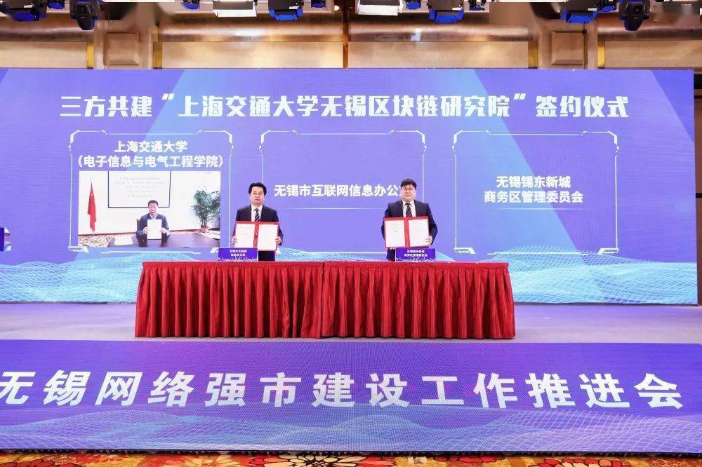 会上,无锡锡东新城商务区管理委员会、上海交通大学(电子信息与电气工程学院)和无锡市互联网信息办公室签订了三方共建无锡区块链研究院合作协议。