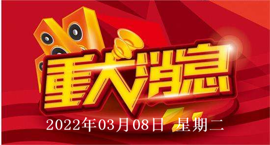 截止2022年03月08日收盘,上证指数报收3293.53点,下跌2.35%;深证成指报收12244.50点,下跌2.62%;中小100报收8354.30点,下跌2.58%;创业板指报收2582.99点,下跌1.80%。一起来看看市场上又发布了哪些重要消息资讯!