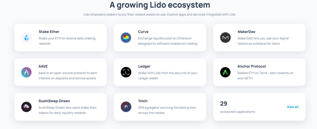 当使用 Lido 在以太坊信标链上质押 ETH 时,用户将收到一个代币 stETH,它以 1:1 的比例代表用户在以太坊信标链上的 ETH。每当用户收到质押奖励时,stETH 余额也会相应更新一次。最重要的是stETH可以直接当ETH使用,包括出售、在DeFi平台(下图)进行借贷的抵押等等,这解决了用户的流动性缺失和机会成本的问题。