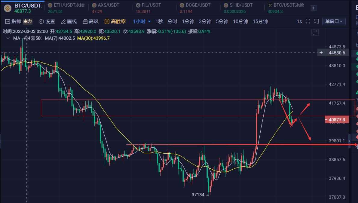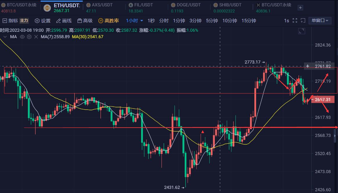 昨日市场快速拉升之后行情表现并不是延续上涨的强势,小级别上涨进入区间之后没有快速调整好状态,以太盘中维持在2760-2680区间内并没有太大的突破,虽然大饼盘中表现强势上冲压力位并有所突破,但是表现最终没能保住战果,尾盘开始持续下跌开始走弱,而且今日早间行情快速一波下跌全部跌破了区间内的下方低点支撑,目前相对来说都处于下方底点支撑位置附近开始走势纠结,今日则需要重点关注下方支撑压力位置的得失,也就是大饼看40800附近,以太看2680一线。