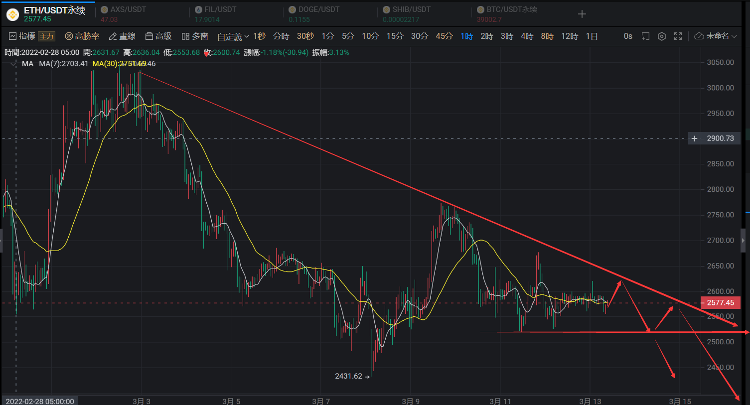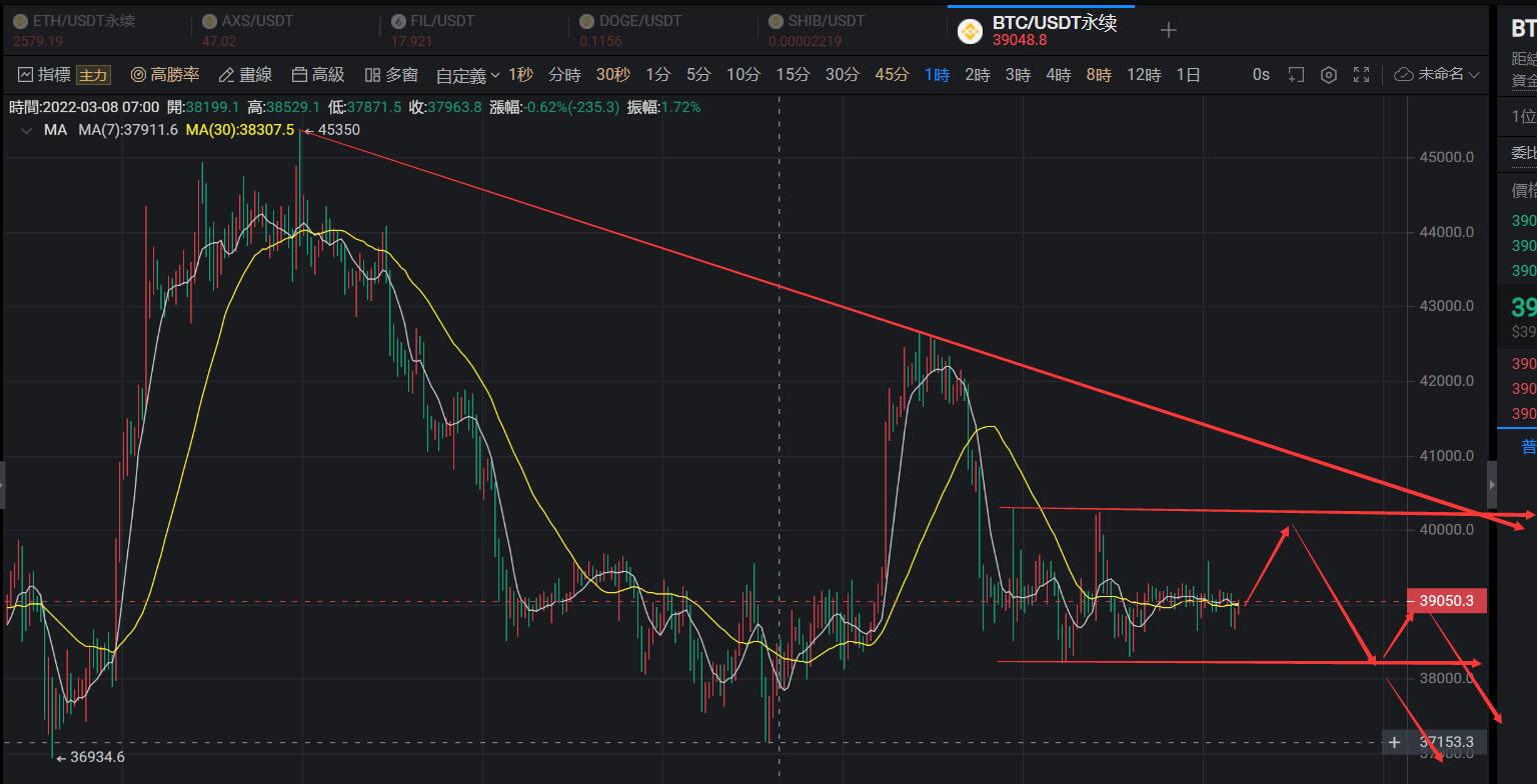 就目前来说,大饼的走势方向虽然还没有做出突破,但是上方的反弹多次遇阻,大方向上面还处于空头运行阶段,那么顺大方向去做布局还是今天的主要思路,昨日视频上面有给出的参考区间是在39500-40000关口区间,今天依然还是如此,这里的区间是多次反弹上去的阻力位,小级别的上涨多次到这一位置开始拐头,早讲行情波动不大的情况下,初步往上再探高点只要不突破上方的压力区间,该跌拐头向下的空间还是会走出,不要总想着一个调整的行情就开始抄底,短期来看大饼还有进一步向下的空间,不说试探前期大幅回撤的最低点29000附近吧,但是再探一探下方33000一线的次低点是大概率事件,做交易总要考虑全面,日线级别的向下趋势没有一波大幅下跌的测试企稳,反转没那么容易,前期多次日线级别上冲都在45500一线开始拐头就是最好的例子。日内思路,利用行情向39500-400000关口反弹的机会分批今天空单,止损带40500一线,目标的话先看下方38200一线阶段性低点能否跌破。
