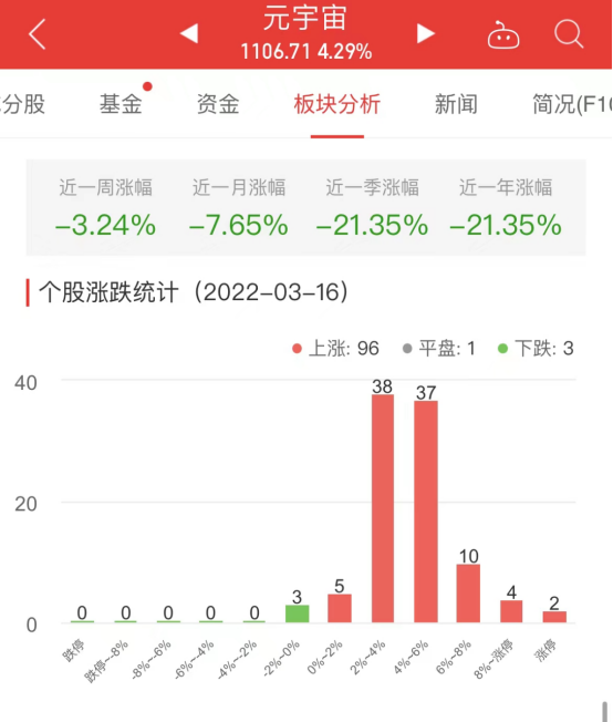 中国经济网北京3月16日讯?今日,元宇宙板块整体涨幅4.29%,其中96只股票上涨,1只股票平盘,3只股票下跌。