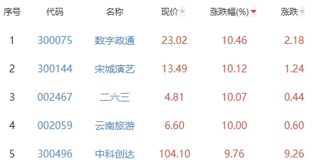 其中,数字政通、宋城演艺、二六三、云南旅游、中科创达位列板块涨幅前五位,涨幅分别为10.46%、10.12%、10.07%、10.00%、9.76%。?