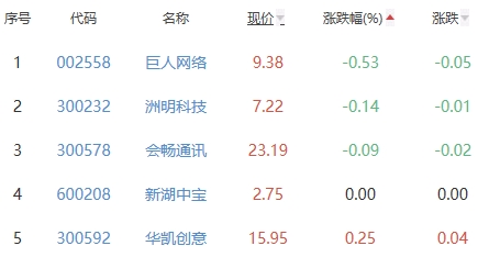 巨人网络、洲明科技、会畅通讯、新湖中宝、华凯创意位列涨幅榜后五位,涨幅分别为-0.53%、-0.14%、-0.09%、0.00%和0.25%。?
