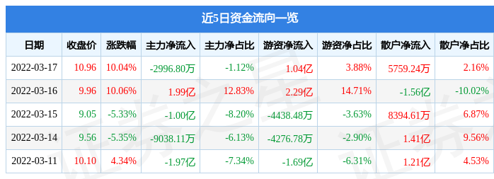 资金流向数据方面,当日主力资金净流出2996.8万元,游资资金净流入1.04亿元,散户资金净流入5759.24万元。近5日资金流向一览见下表: