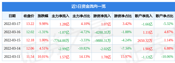 资金流向数据方面,当日主力资金净流入1.28亿元,游资资金净流入1.07亿元,散户资金净流出1.66亿元。近5日资金流向一览见下表: