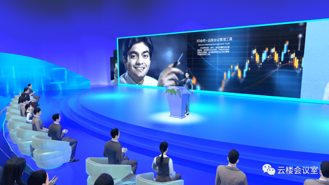 云楼元宇宙会议室设有三块共享大屏,可以进行视频直播及屏幕共享,不论是异地进行远程签约,还是视频教学讲解,都可以轻松实现,同时还可以通过点击头像获取电子名片的方式,挖掘潜在客户。