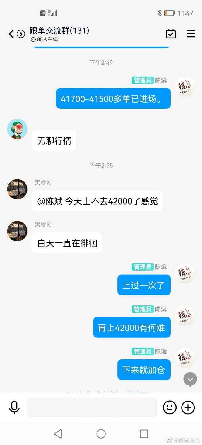 行情不是抓出来的,而是用技术分析,任何一个波动盘面都会给出信号,但相信并执行或发现的人往往都是少数。每一次单边的洗礼会让朋友们懂得不少,周一笔者38000入场多单,周周二38500-38200再次做多,周三早上39200直接做多,美联储会议前后依旧从39800、40700、昨天41700等位置一路做多上来全部胜利!很多朋友不相信,认为空头行情,嘲笑与怀疑却让市场狠狠的给了一巴掌。追涨杀跌是一个金融市场必然存在的现象,短期比特币站上42000那么继续一波多头行情的延续,但切记并不意味任何时候都去做多,多空博弈的时间,再大的蛤蟆也挡不住车,再厉害的个人投资也改变不了市场的节奏。