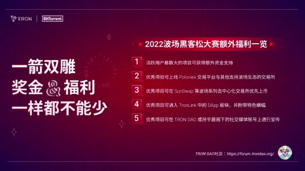 这是一场区块链行业的盛事,也是一场程序员世界的大联欢,2022波场黑客松大赛给予了行业内的技术从业者以资金和扶持,同时也提供了一个技术交流的平台。获奖的项目团队除了可以享受巨额的奖金外,还能享受到波场超8200万的用户流量,除此以外,波场完整的生态、方便快速的公链底层支持、在TRON DAO 或孙宇晨社交媒体提供曝光等等都是其他黑客松大赛不能赋予的软性福利。