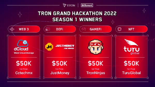 历经1个多月的激烈角逐,由TRON DAO和BitTorrent Chain(BTTC)共同举办的2022波场黑客松大赛第一季完美收官了。大赛共收到120 余件参赛作品,根据最终评委团的意见和投票数,dCloud、VersacBrickSquad、TronNinja Arcade、JustMoney Exchange分别斩获了Web3、NFT、GameFi、DeFi四大赛道的第一名,各赛道均有5个项目获奖,奖金总额高达 50 万美元。