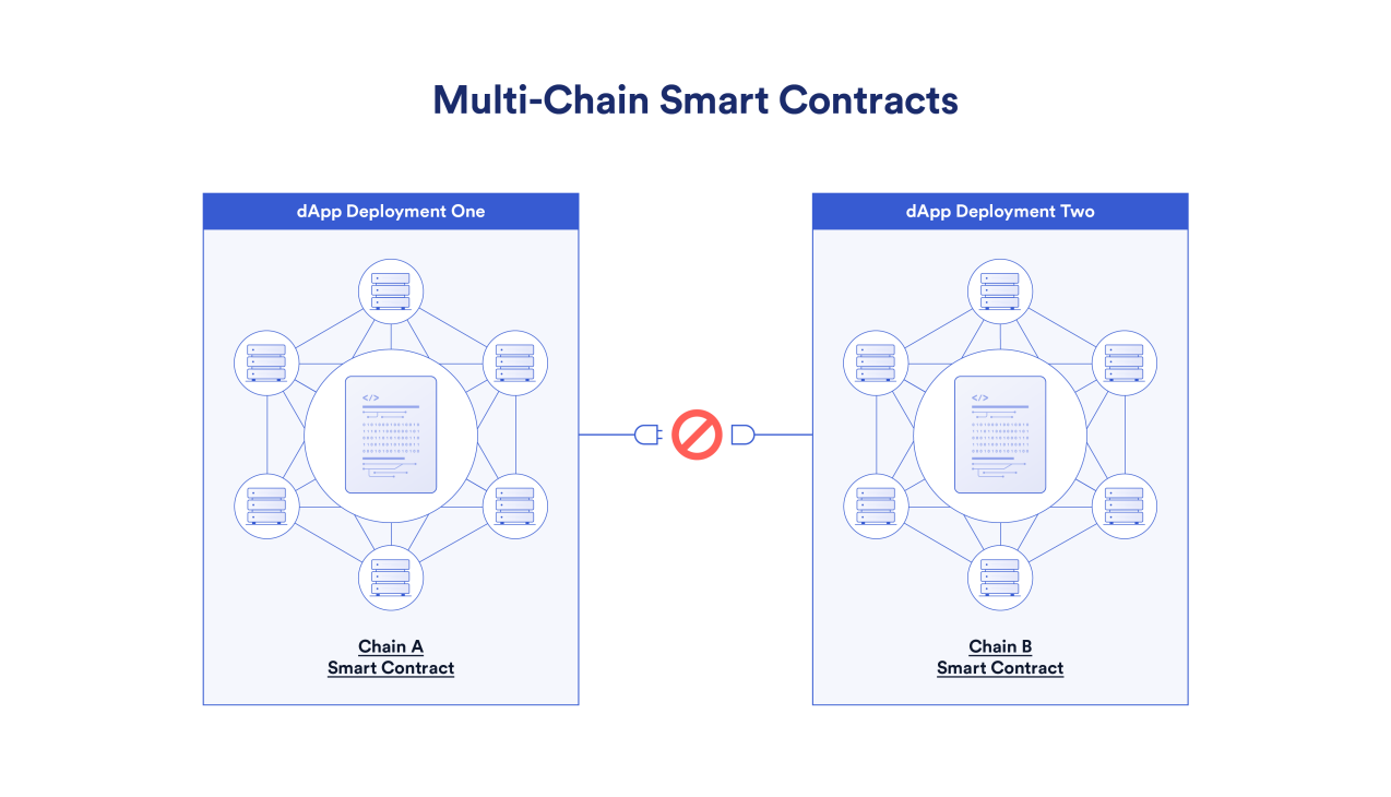 首先,多链智能合约的代码每部署到一个新的区块链上,都需要创建一份原应用的副本,这就意味着应用不再具有唯一性。相反,部署在每条链上的智能合约都管理着自己的内部状态(比如追踪账户余额),而不同区块链上的合约几乎或甚至完全不能直接交互。虽然用户可以访问任何一条链上的应用副本,但不同链上的用户体验不能保证完全一样。